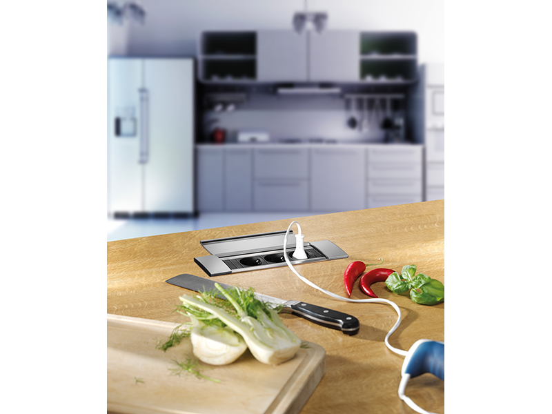 Dass die gewählte Steckdoseneinheit ohne Werkzeug einfach von unten in den Einbaurahmen eingesteckt wird, macht die Sache perfekt. Power Frame, wenn die Lösung kompakter und effizienter sein soll.