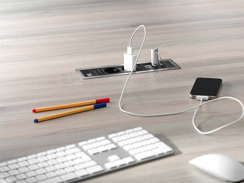 Power Frame ist die kompakte Lösung für den integrierten und leicht zugänglichen Energie- und Datenanschluss von Arbeitsplätzen. Entweder für den Einbau ab Werk, oder auch für den nachträglichen Einbau.