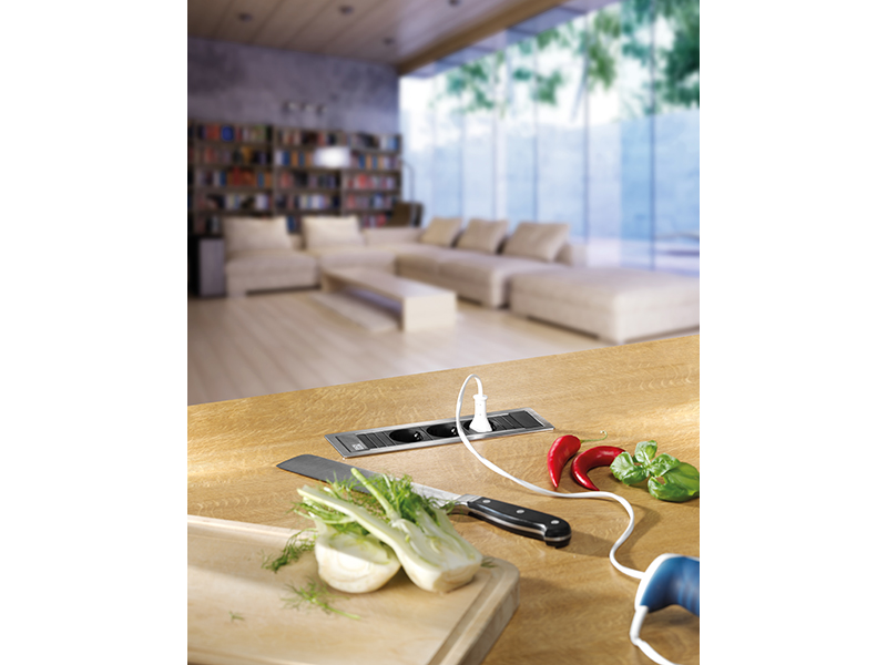 Mit der Bachmann Power Frame Steckdoseneinheit 3-fach, 1x Steckdose 1x Custom Module 1x USB Doppelcharger (916.0039) kann eine Steckdose nach den individuellen Bedürfnissen angepasst werden. Mit dem Bachman Power Frame Einbaurahmen kurz kann die Steckdoseneinheit diskret im Tisch eingebaut und ein unschönes Kabelchaos verhindert werden.