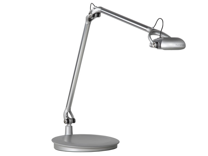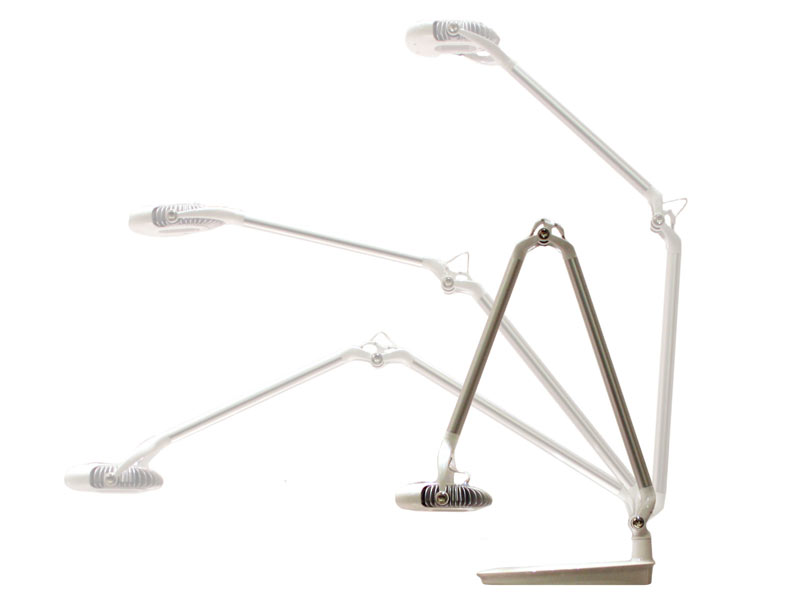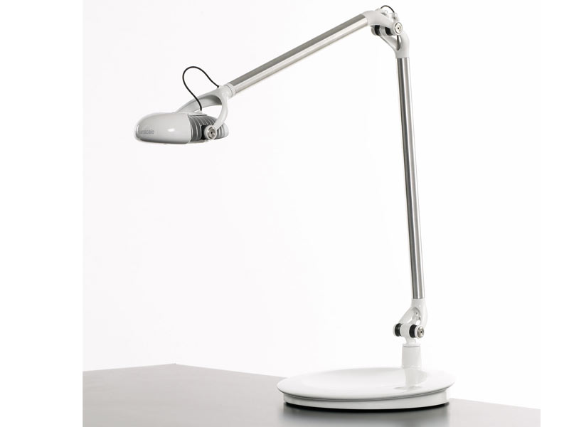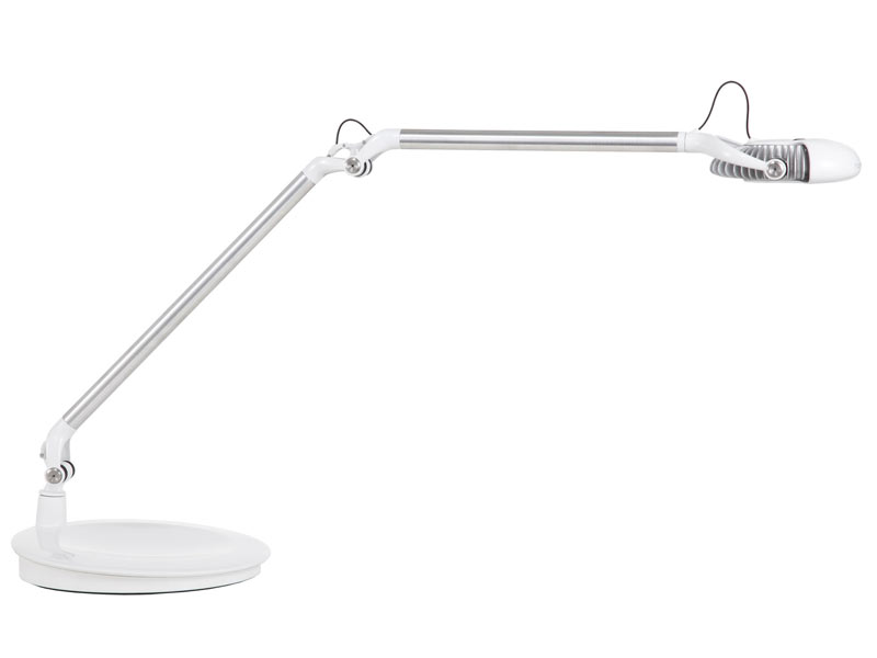 Die weiße Humanscale Element 790 LED Tischleuchte mit 7-fach Dimmer verfügt über einen zweifachen Gelenkarm und erzeugt Licht in neutralweiß 3500 K.