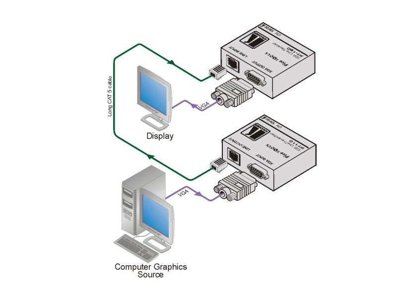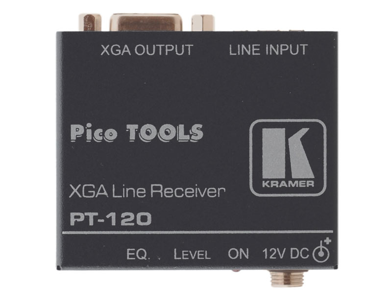 Der Kramer PT−120 ist ein Twisted Pair Empfänger für Computergrafik−Videosignale. Er wandelt ein Twisted Pair Signal von einem PT−110 Übertrager (oder anderen kompatiblen Kramer Übertragern) zurück in ein Computergrafik−Sign