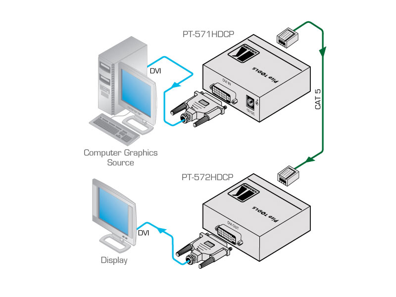 Der Kramer PT−572HDCP+ ist ein DGKat™ Twisted Pair Empfänger für DVI−Signale. Der Kramer PT−571HDCP wandelt ein DVI−Signal in ein digitales Twisted Pair Signal, und der Kramer PT−572HDCP+ wandelt das eingehende Twisted Pair Signal zurück in ein DVI−Signal.