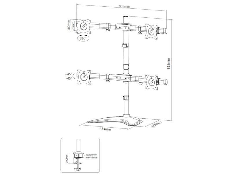 Der Neomounts by NewStar NeoMounts NM-D335D4BLACK Monitorhalterung für 4 Monitore in schwarz ist für vier Monitore von 10 bis 27 Zoll mit einem maximalen Gewicht von bis zu 8 kg pro Monitor geeignet. Es besteht die Möglichkeit die Halterung anhand einer Tischklemme oder einer Tisch Durchschraubbefestigung zu montieren oder den Monitor ganz einfach mit dem Standfuß auf den Schreibtisch zu stellen. Die Höhe der Bildschirme können manuell von 0 bis 810 mm verstellt werden. Displays mit einer VESA Aufnahme von 75x75 und 100x100 mm sind mit der Halterung kompatibel.