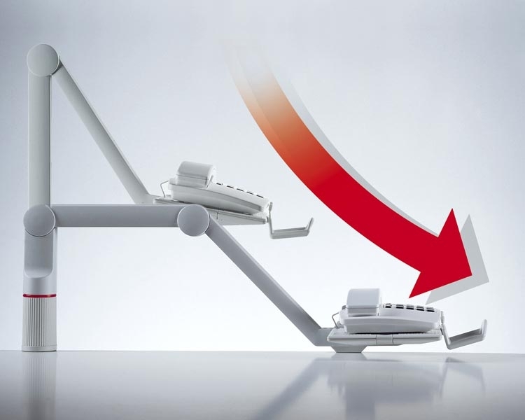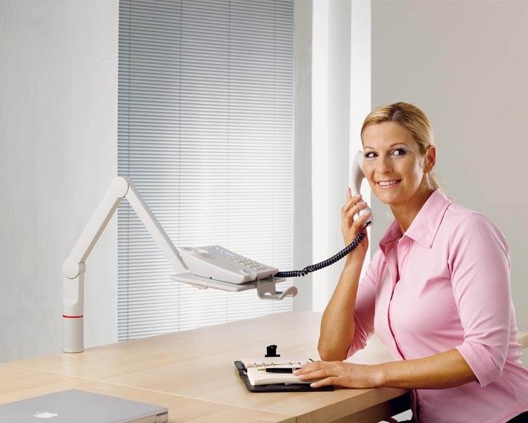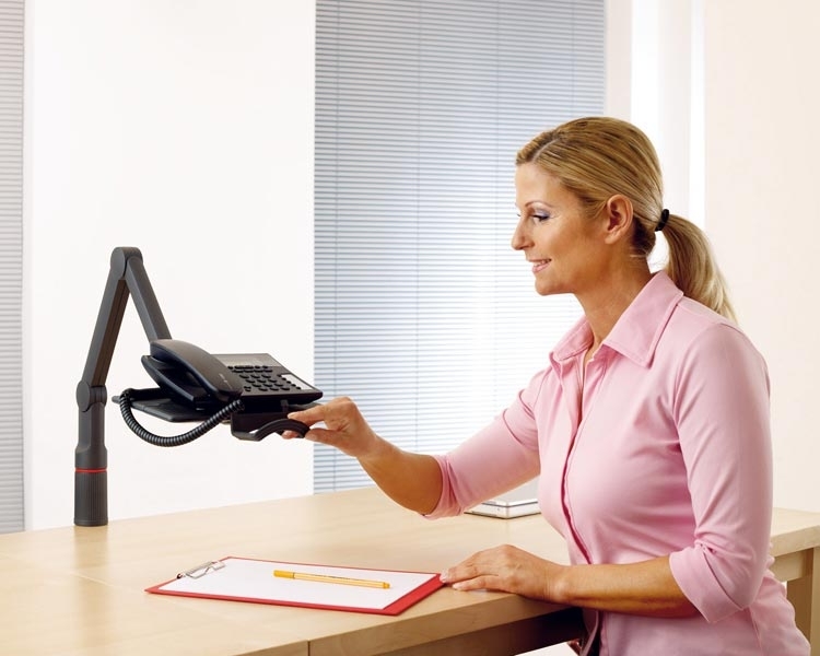 Novus Telefonschwenker mit 2-teiligem Gelenkarm für die Positionierung in 3 festen Stufen. Die flexible Tragplatte lässt sich quer oder längs montieren.