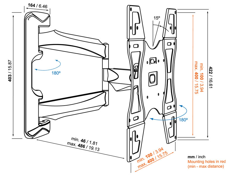 - Schwenkbar: 180 Grad (90 Grad nach links und 90 Grad nach rechts)
