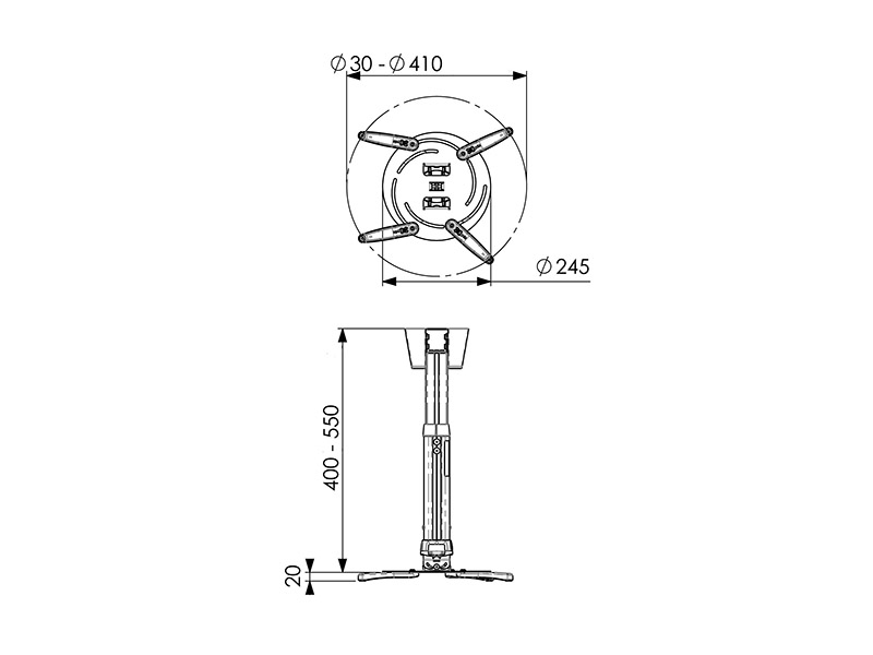 Mit seiner einzigartigen Befestigung kann der Projektorhalter sowohl an schrägen, als auch an flachen Decken angebracht werden. Auch nach der Montage lässt sich der Projektor noch bequem in alle Richtungen drehen und um bis zu 15° neigen, um eine optimale Ausrichtung zu garantieren. Die Säule mit integriertem Kabelkanal kann zwischen 400 und 550 mm in der Höhe verstellt werden und trägt ein Gewicht von bis zu 25 kg sicher und zuverlässig. Die Abdeckung für Zwischendecken ist im Lieferumfang enthalten.